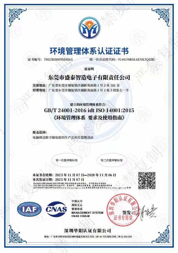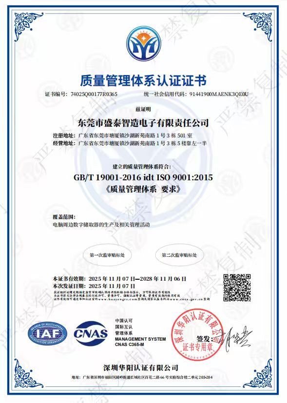 东莞市盛泰智造电子有限责任公司是一家专注于存储产品研发、生产与一站式解决方案的高新技术企业,提供专业的OEM和ODM服务,具备ISO90001 /140001 、Bsci等权威资质认证。